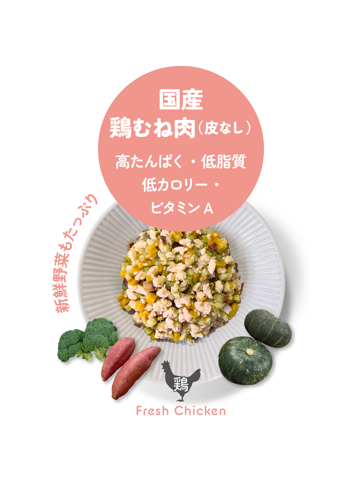 鶏肉(国産 若どり むね 皮なし)、さつまいも(皮あり)、かぼちゃ、ブロッコリー、いりごま、あまに油、葛でん粉(葛)
