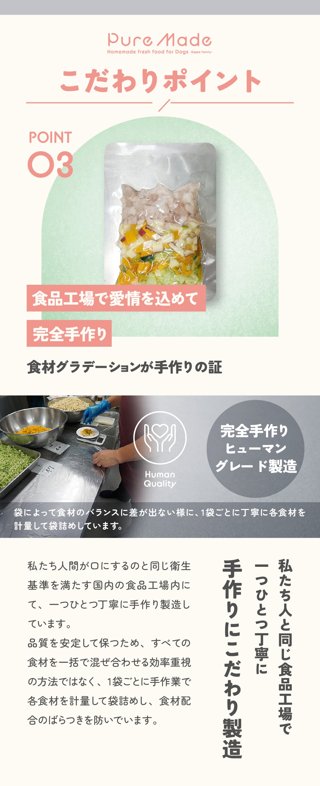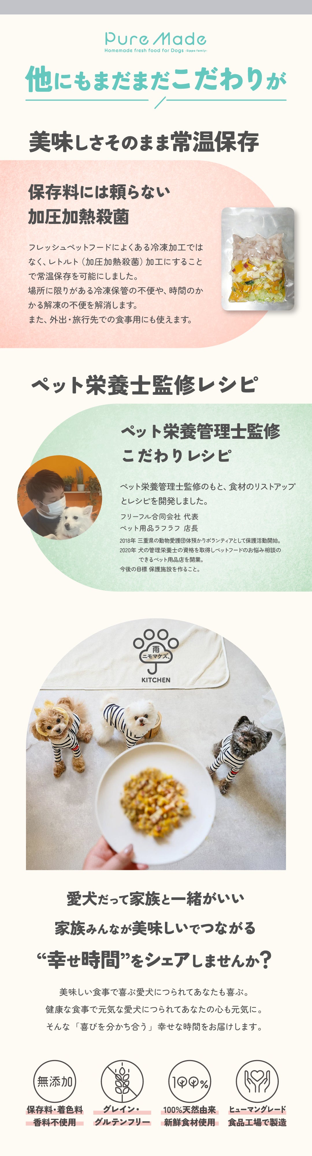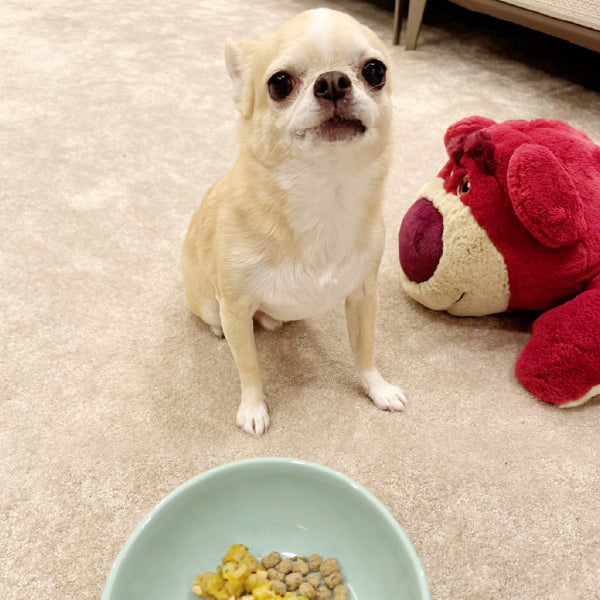 いつもご飯はゆっくり食べる子なのですが、これはすごい勢いで一気に食べていました!食べ終わった後も「もうないの?」みたいな顔でお座りして見つめられてしまいました!!大きさ、柔らかさも消化に良さそうなので、パピーからシニアのわんちゃんまで安心してあげられますね。
